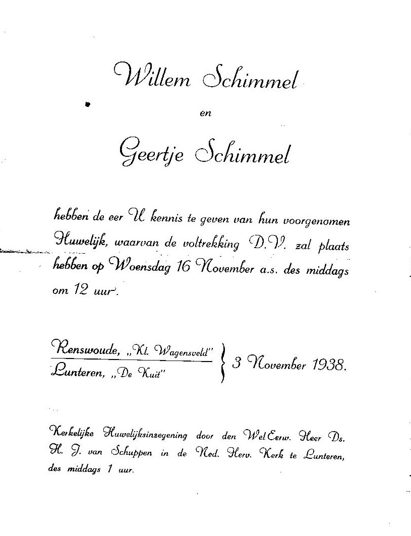 Echtgenote: Geertje Schimmel overleed op de leeftijd van: 89 Ondertrouw: 3 Nov 1938 Burgerlijk huwelijk: 16 Nov 1938 te Ede Kerkelijk huwelijk: 16 Nov 1938 te Lunteren, in de N.H.-Kerk Geboren: 4 Okt 1916 te Walderveen (Ede) Gedoopt: te Lunteren (Ede) denis van het geloof: 17 Mrt 1940 te Scherpenzeel Overleden: 27 Jun 2006 te Loenen (Apeldoorn) Begraven: 1 Jul 2006 te Ugchelen, Begraafplaats Heidehof Vader: Antonie Schimmel (1885 - 1969) Moeder: Maria van de Glind (1891 - 1973) Notities + M Kind 1: Evert Jan Schimmel Geboren: (Gegevens privé) Echtgenote: Jantje van Zeumeren geb. (Gegevens privé) + V Kind 2: Maria Schimmel Geboren: (Gegevens privé) Echtgenoot: Gerrit Koenders geb. (Gegevens privé) + M Kind 3: Anthonie Schimmel Geboren: (Gegevens privé) Echtgenote: Alie Jansen geb. (Gegevens privé) + V Kind 4: Arnesta Wilhelmina Schimmel Geboren: (Gegevens privé) Echtgenoot: Johan Herman ten Hoeve geb. (Gegevens privé) + M Kind 5: Willem Schimmel Geboren: (Gegevens privé) Echtgenote: Elisabeth G. M. Wismans geb. (Gegevens privé) V Kind 6: Geertruida Schimmel Geboren: (Gegevens privé) Partner: Christiaan van Oorspronk geb. (Gegevens privé) M Kind 7: Albert Schimmel Geboren: (Gegevens privé) Echtgenote: Martina Reina Johanna Brand geb. 10 Jan 1957 overl. 5 Jul 1992 (c) 1999-2025 De familie Schimmel www.tschimmel.nl Naamindex