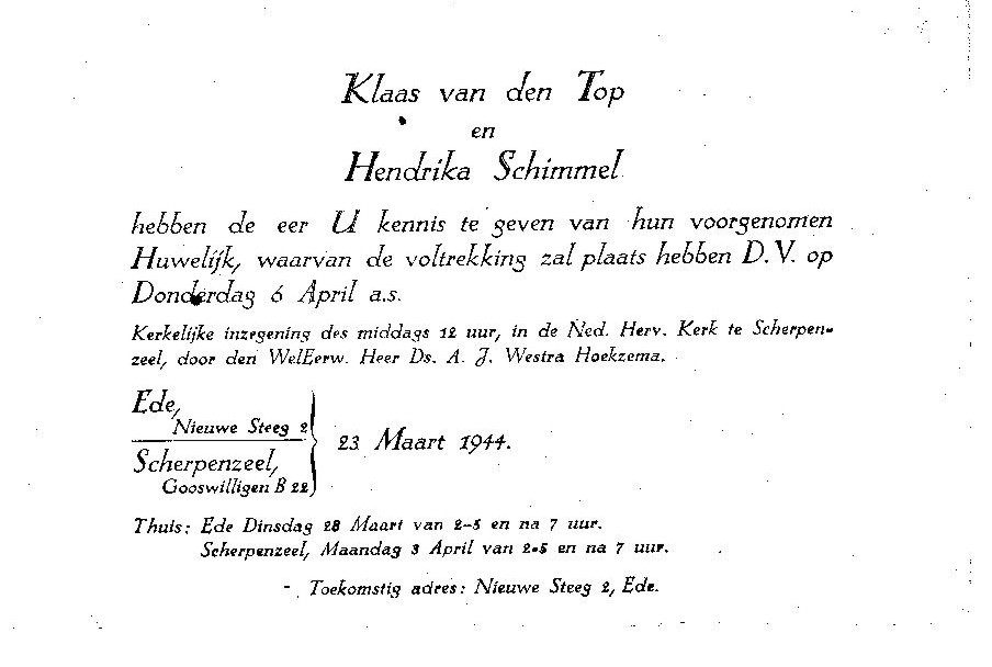 Echtgenote: Hendrika Schimmel overleed op de leeftijd van: 90 Ondertrouw: 23 Mrt 1944 Burgerlijk huwelijk: 6 Apr 1944 te Scherpenzeel Kerkelijk huwelijk: 6 Apr 1944 te Scherpenzeel, in de N.H.-kerk Geboren: 29 Apr 1918 te Walderveen (Ede) Gedoopt: te Lunteren (Ede) denis van het geloof: 17 Mrt 1940 te Scherpenzeel Overleden: 27 Dec 2008 te Lunteren (Ede) Begraven: 2 Jan 2009 te Lunteren, op de Gemeentelijke Begraafplaats Kerkhoflaan Vader: Antonie Schimmel (1885 - 1969) Moeder: Maria van de Glind (1891 - 1973) Notities + V Kind 1: Rikje van den Top overleed op de leeftijd van: 73 roepnaam: Rieky van den Top Geboren: 19 Aug 1944 te Ede Gedoopt: te Ede Overleden: 20 Mrt 2018 te Rhenen Begraven: 24 Mrt 2018 te Rhenen, op Begraafplaats Larikshof Echtgenoot: Dirk van de Lagemaat geb. 24 Feb 1943 overl. 5 Nov 2003 Getrouwd: 23 Sep 1965 te Ede Kerkelijk huwelijk: 23 Sep 1965 te Ede + M Kind 2: Anthonie van den Top Geboren: (Gegevens privé) Echtgenote: J.C. Septer geb. (Gegevens privé) + V Kind 3: Wilhelmina Maria van den Top Geboren: (Gegevens privé) Echtgenoot: Hans Jansen geb. (Gegevens privé) M Kind 4: Willem Gijsbert van den Top Geboren: (Gegevens privé) Echtgenote: Christien Nn geb. (Gegevens privé) (c) 1999-2025 De familie Schimmel www.tschimmel.nl Naamindex